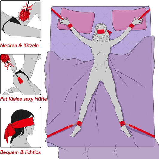 UTIMI BDSM-Set Bettfesseln - Set mit Bettfesseln, Handschellen, Peitsche und Augenmaske für erotisches Bondage-Spiel für Paare, rot